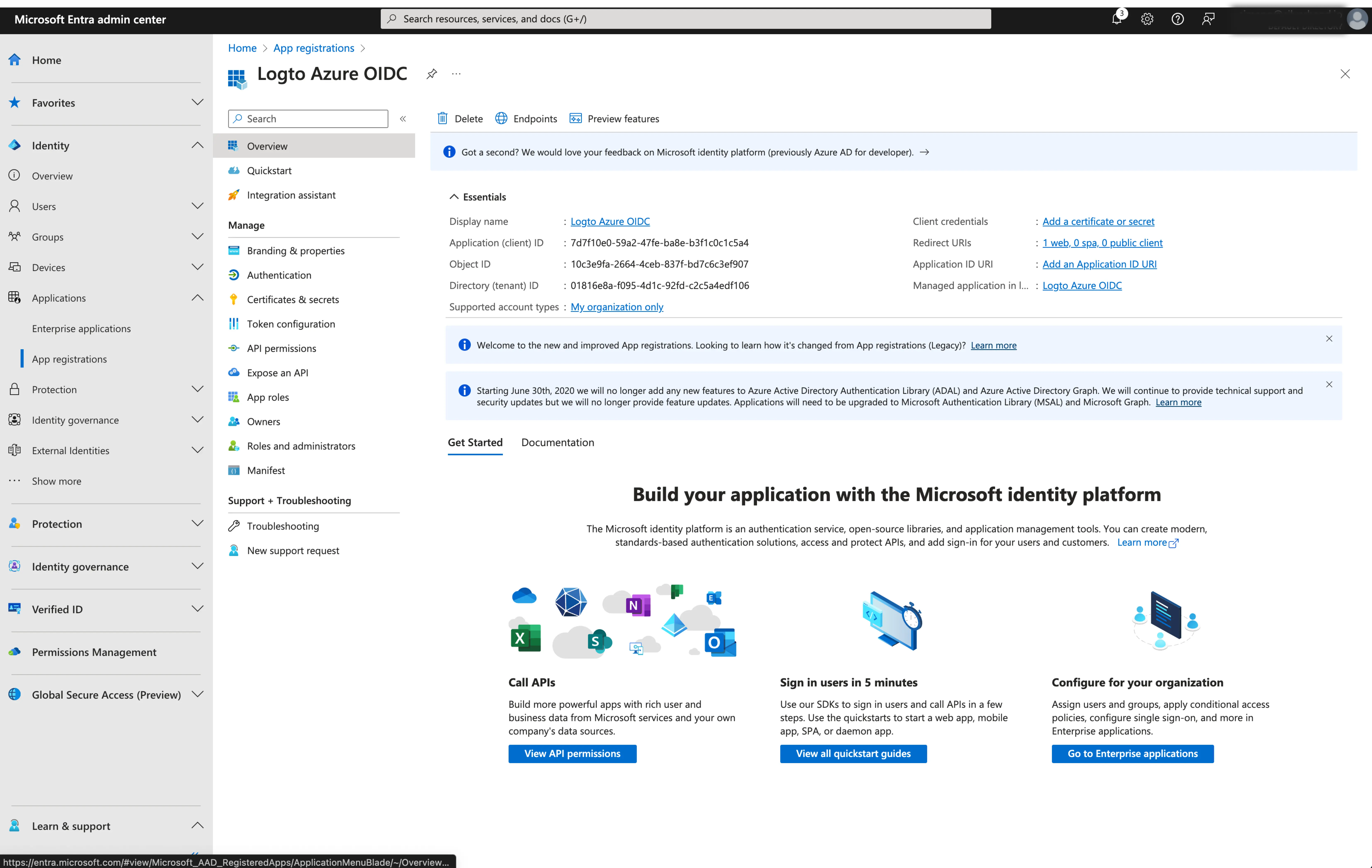 - Client ID: A unique identifier assigned to your OIDC application by the Microsoft Entra. This identifier is used by Logto to identify and authenticate the application during the OIDC flow. You can find it in the application overview page as
